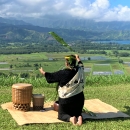A Hawaiian cultural practitioner blesses the new location for the Hanalei Valley Viewpoint within the Hanalei Refuge in November 2021. The Hanalei Valley and taro fields are below. Hanalei Bay can be seen in the distance.