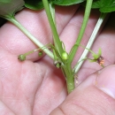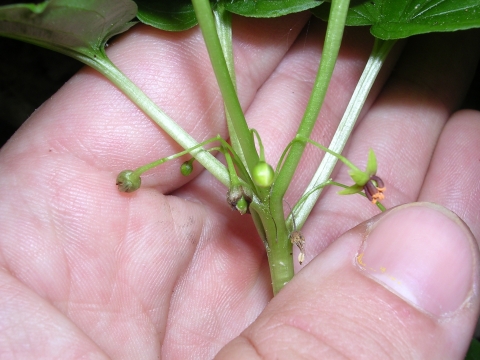 Close-up view of hand holding endangered plant species Croomia stem, blooms, and leaves. Photo taken in Chattahoochee, FL.