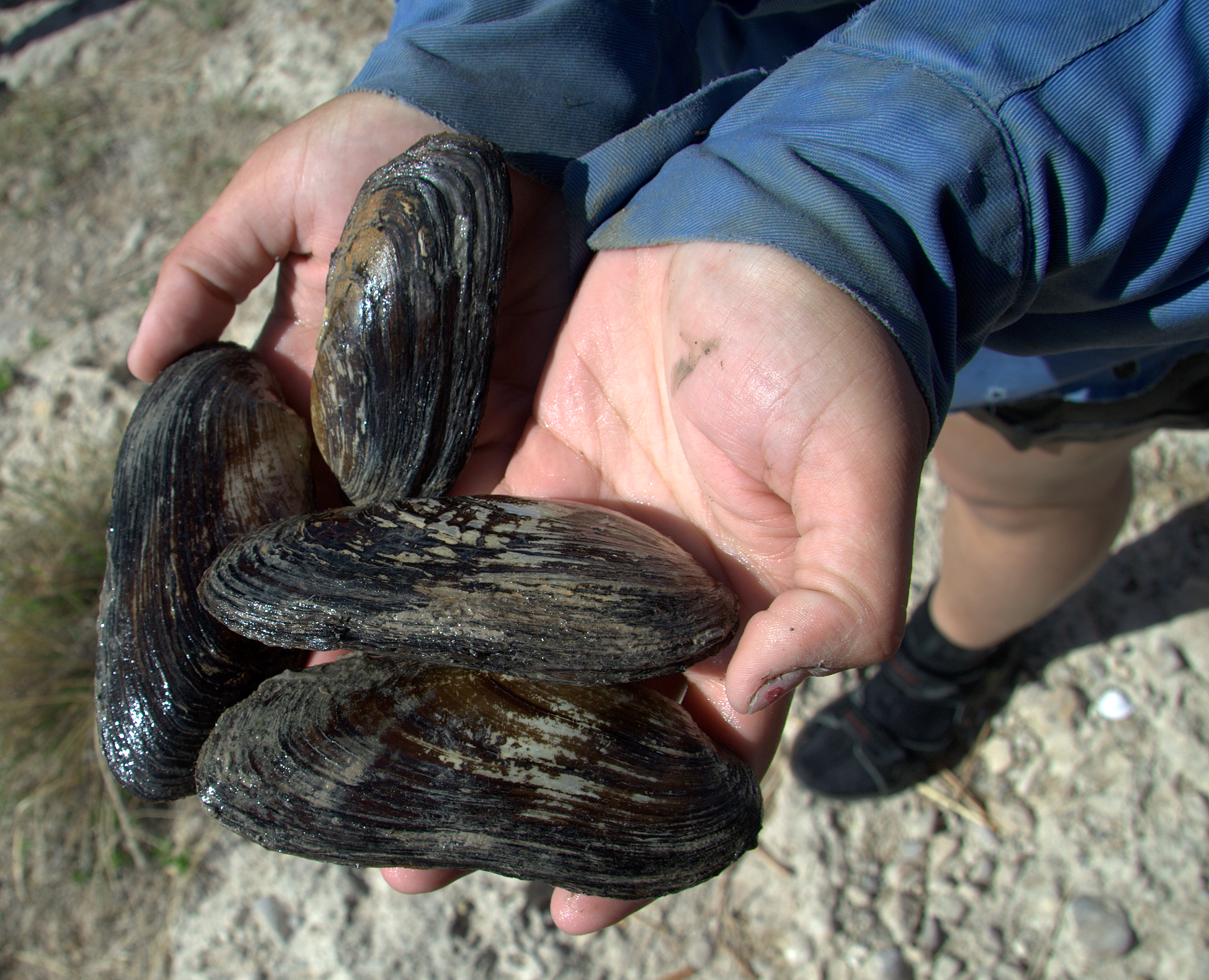 Hands holding four Texas hornshell mussels