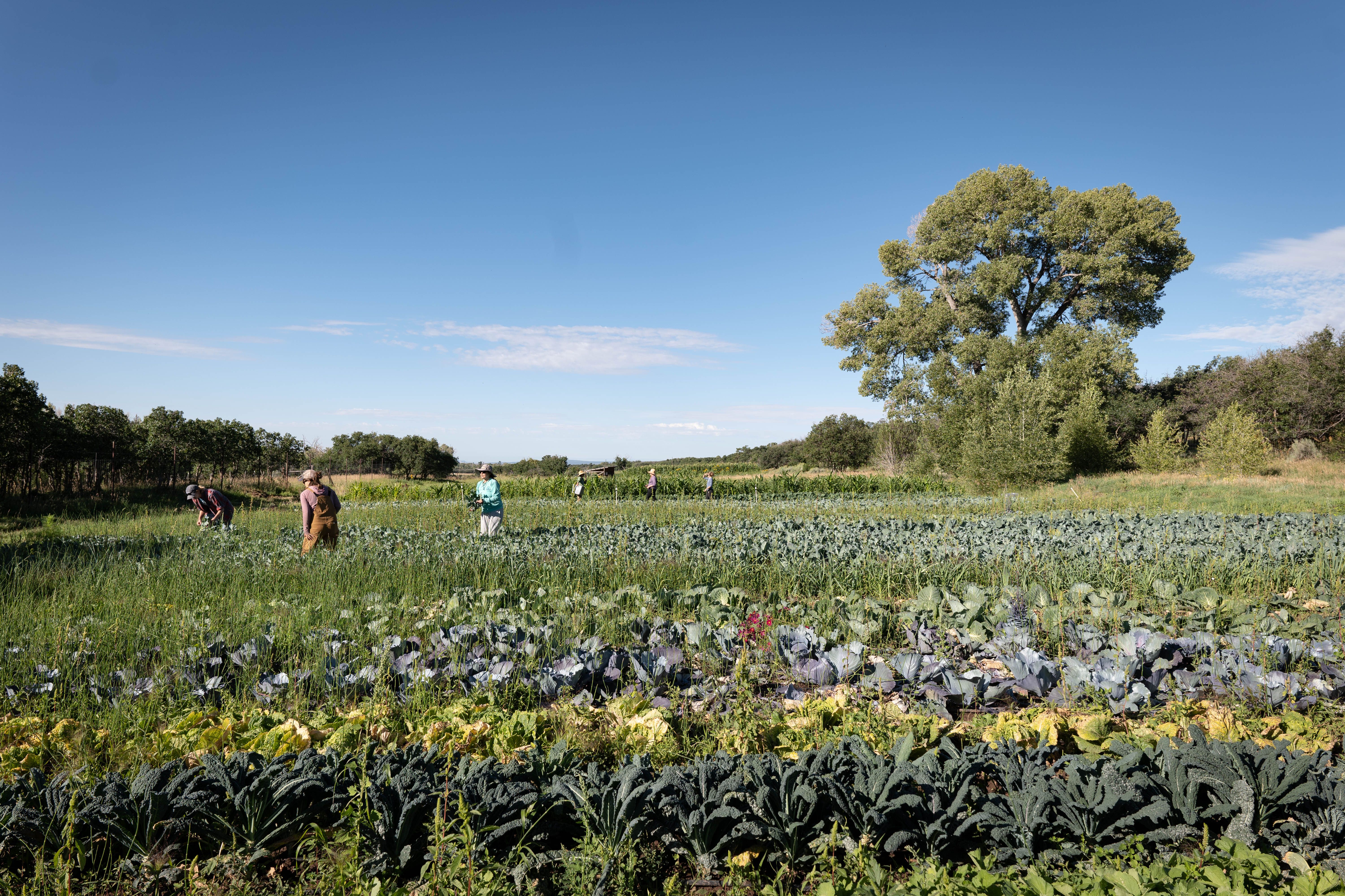 Farmers in training harvesting broccoli in the brassica plot of the farmer training field.