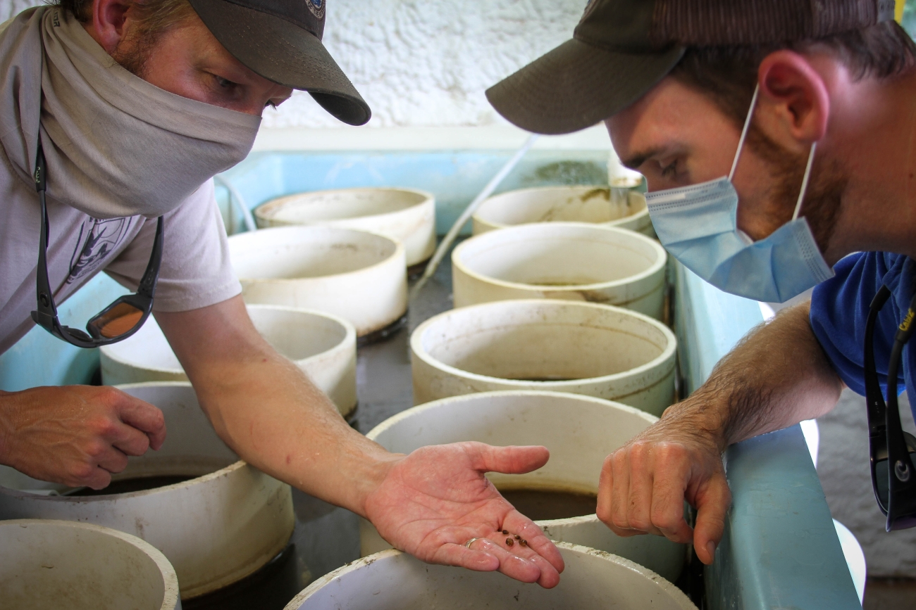 U.S. Fish and Wildlife Service Fisheries Biologist Bailey Gaines (left) shows some of the juvenile Texas fatmucket mussels produced at Inks Dam National Fish Hatchery to U.S. Fish and Wildlife Service Freshwater Mussel Biologist Gary Pandolfi during a visit to the hatchery July 28, 2020. (Photo: Aubry Buzek/USFWS)