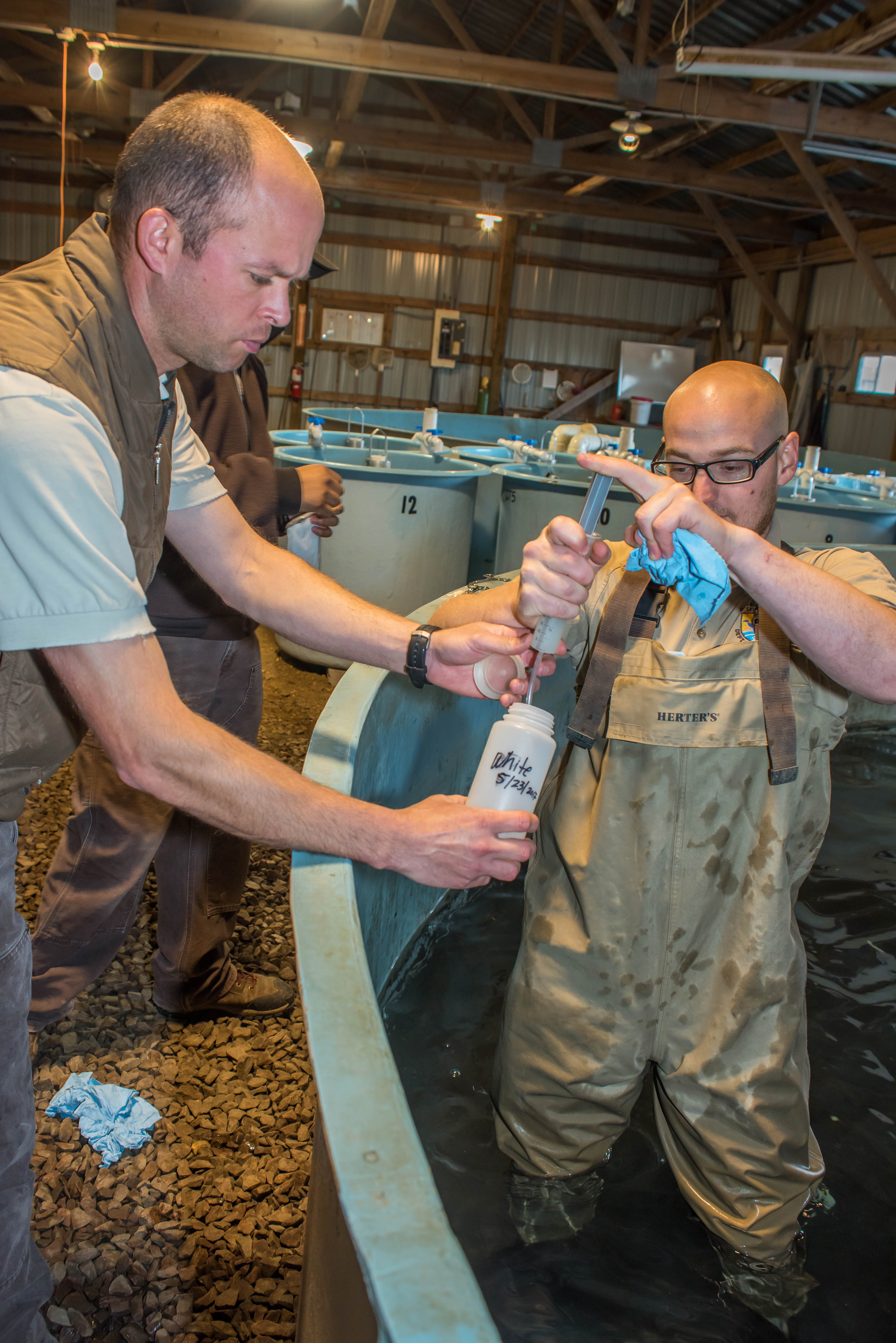 Hatchery worker transfers paddlefish milt to container