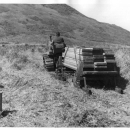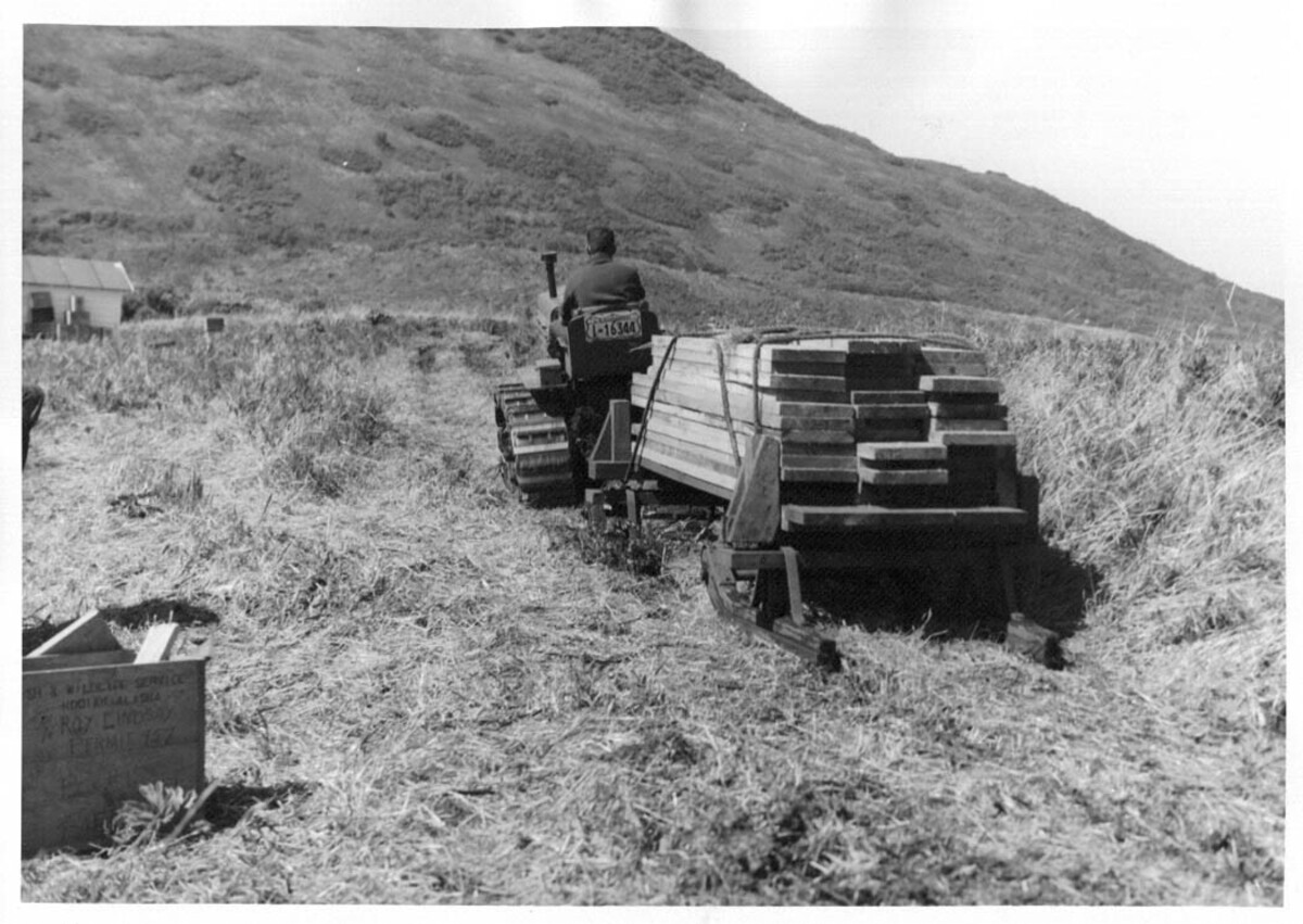 Karluk Investigations 1949. "Tractor hauling weir lumber from lake shore to building site of proposed 2-way counting weir on Karluk River, Kodiak."