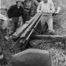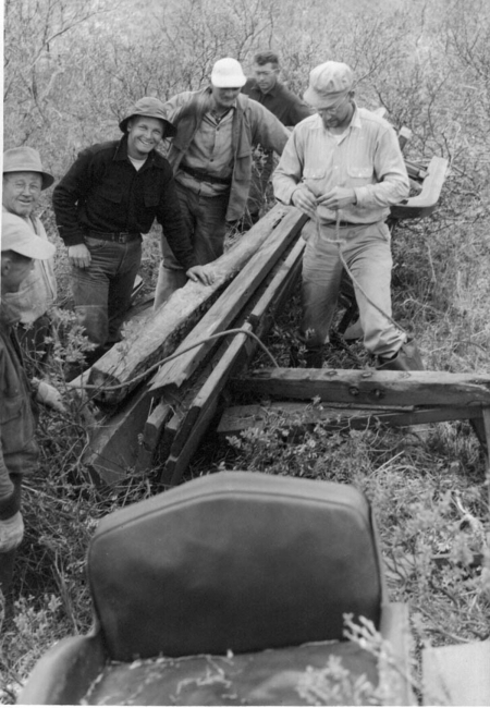 Karluk Investigations 1949. Kodiak Island. "Rough country between Larsen Bay and Karluk Lake - one of the many mishaps enroute while hauling lumber for use in construction of 2-way counting weir on Karluk River."