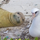 A Hawaiian monk seal and Laysan albatross share a patch of beach at Midway Atoll National Wildlife Refuge, 1,200 miles northwest of Honolulu in the Pacific.