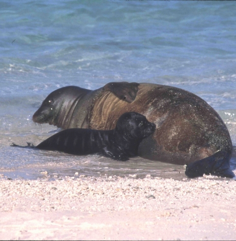 A Hawaiian monk seal with a pup on Midway Atoll National Wildlife Refuge. Image taken from USFWS Pacific Region Flickr page.