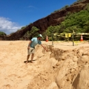 Luke Sundquist co-coordinator of the Hawaii Wildlife Fund Hawksbill Recovery Project, indicates the area where the beach is eroding away below the nest site.