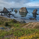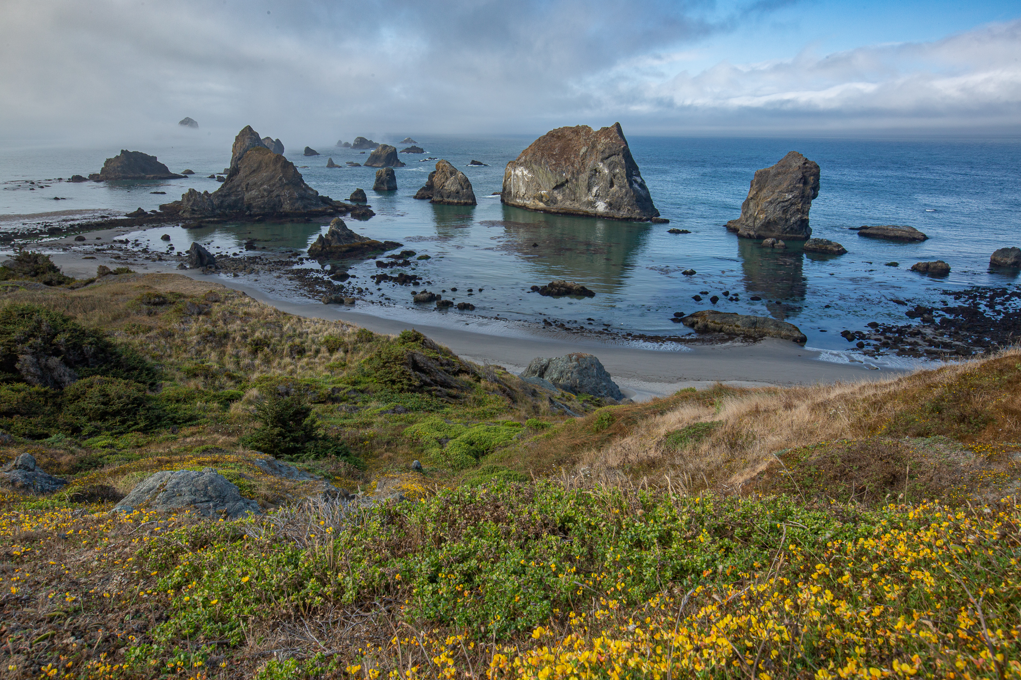 Looking out from a coastal prairie headland at Crook Point, Oregon, toward the offshore rocks of Oregon Islands National Wildlife Refuge.