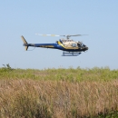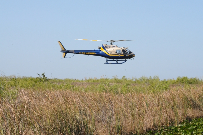 This picture shows a U.S. Fish and Wildlife Service helipcopter performing a practice bucket drop.