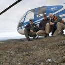 Three FWS employees pose in front of helicopter at the Selawik National Wildlife Refuge.