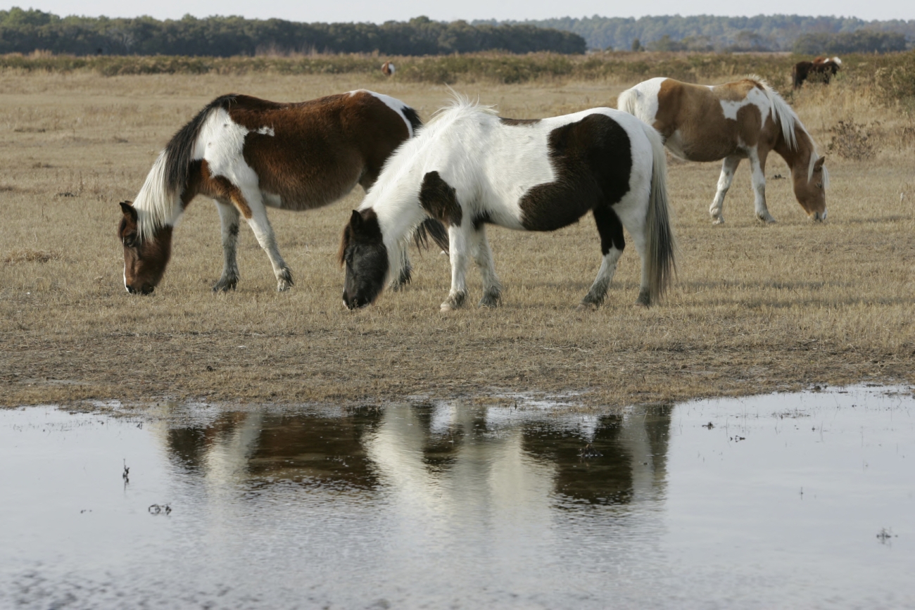 Two herds of Chincoteague ponies graze freely on Assateague Island. Legend has it that the ponies arrived on Chincoteague from a Spanish ship that had run aground during a storm in 1750. Historians believe they are descended from horses brought by settlers in the 1600’s.