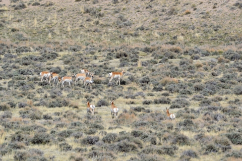A herd of pronghorn antelope foraging in sagebrush habitast near Split Rock, Wyoming.
