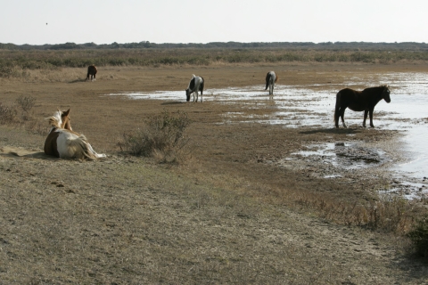 Two herds of Chincoteague ponies graze freely on Assateague Island. Legend has it that the ponies arrived on Chincoteague from a Spanish ship that had run aground during a storm in 1750. Historians believe they are descended from horses brought by settlers in the 1600’s.