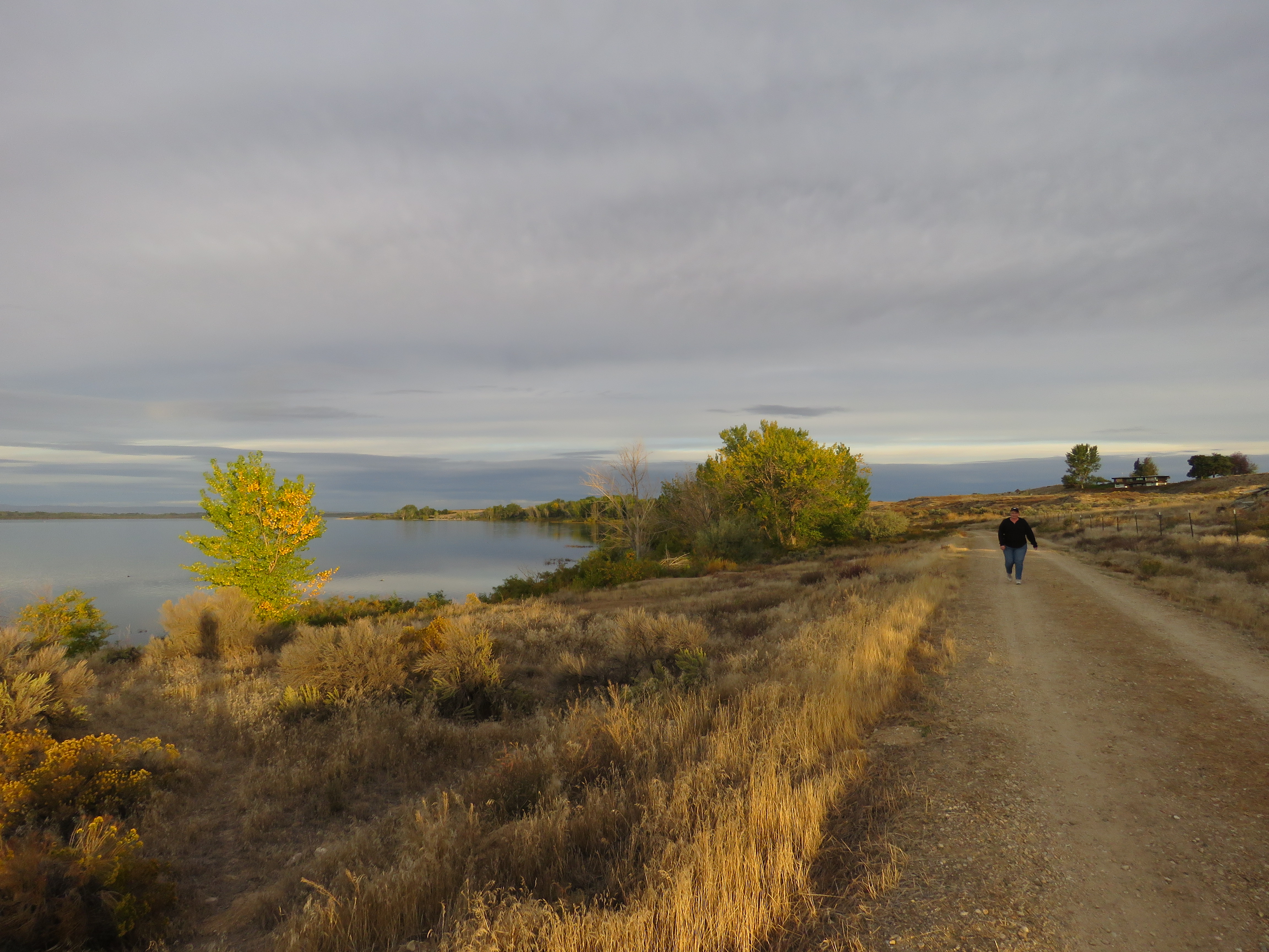 Hiker enjoying the morning light on Lake Lowell along the Kingfisher Trail at Deer Flat National Wildlife Refuge.