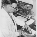 Histopathologist Clarence E. "Ed" Dunbar examining a Brook Trout for the presence of granuloma, National Fisheries Center-Leetown, West Virginia, circa 1960s. Dunbar began working at the National Fisheries Center in the early 1950s, first as Fish Culturalist, and then as a Histopathologist. He passed away in early 1969. He was considered by colleagues as an authority in his field.
