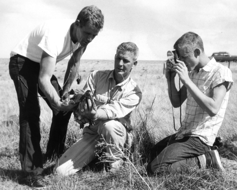 FWS3908 Waterfowl Survey (1957). L - R: John Eadie of Maryville, Tenn. and Jim Robinson of Denver, Colorado, U.S. Game Management Agents, holding immature ducks while Doug Eadie takes a color slide. Jim Robinson is supervisor of one of a number of banding crews operating in Canada.