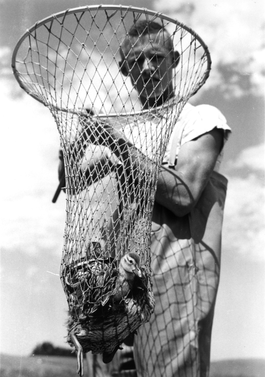 FWS3909 Waterfowl Survey (1957). Doug Eadie holds up net containing ducks of several age classes which will be quickly banded and released. Locality: Swift Current, Saskatchewan Date: July 6, 1957 WATERFOWL SURVEY (1957)