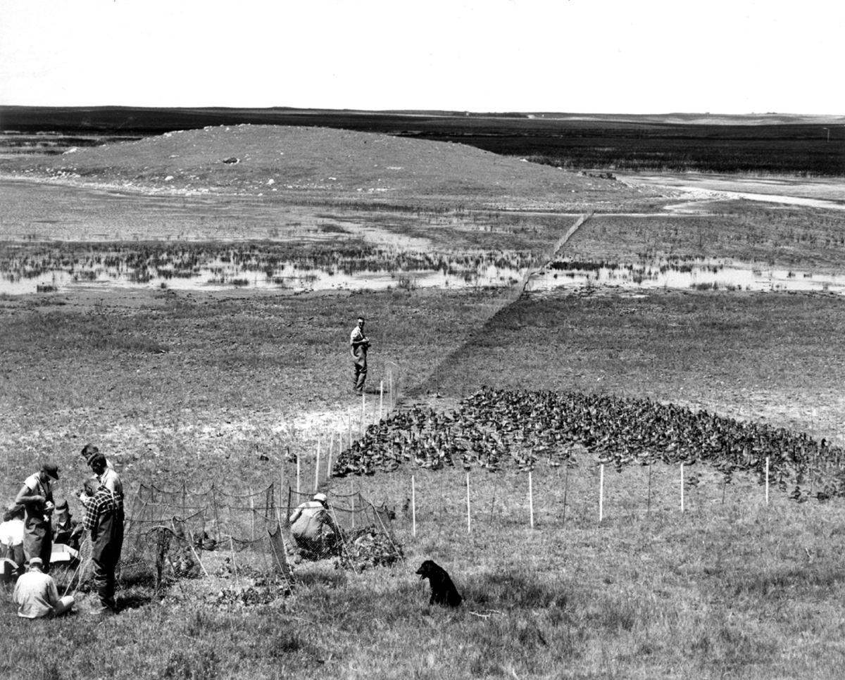 FWS3919 Waterfowl Survey. Sexing, banding and releasing some 1800 trapped ducks. This successful drive netted over 1100 mallards and numerous blue-winged teal, green-winged teal, pintail, gadwall and lesser species Locality: Swift Current, Saskatchewan