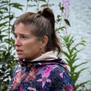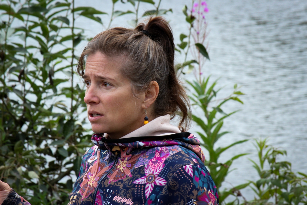 Holly Carroll speaks to a group gathered at Cripple Creek, in front of the Chena River.