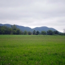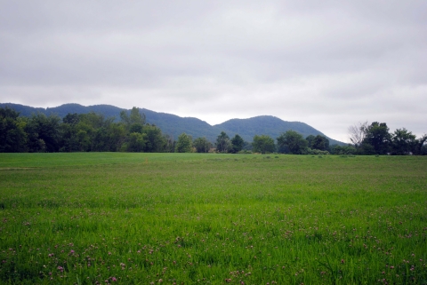 Holyoke Range mountains behind field of red clover, Hadley, Ma.
