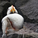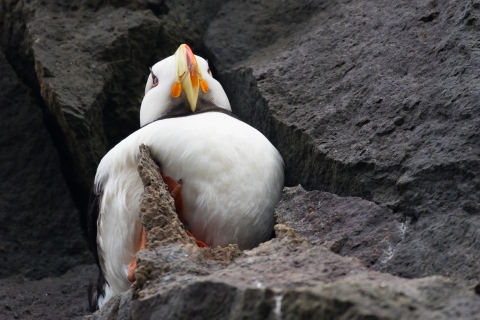 Horned puffin. The Horned Puffin nests in colonies on islands and coastlines of Alaska. It is a smallish, picturesque bird with a large, triangular orange and red bill, and bright orange legs and feet. Because of its coloration, the Horned Puffin was named “sea parrot” and “clown of the sea” by early sailors.