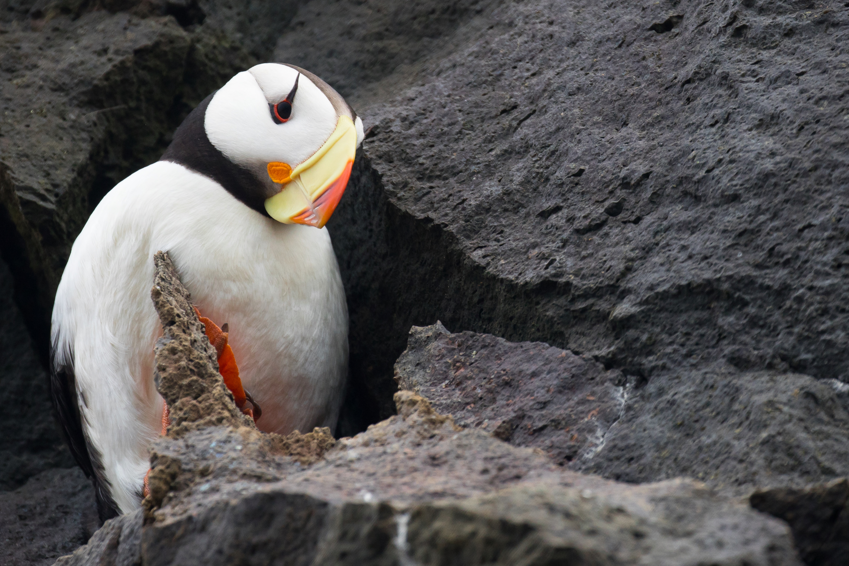 Horned puffin. The Horned Puffin nests in colonies on islands and coastlines of Alaska. It is a smallish, picturesque bird with a large, triangular orange and red bill, and bright orange legs and feet. Because of its coloration, the Horned Puffin was named “sea parrot” and “clown of the sea” by early sailors.