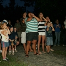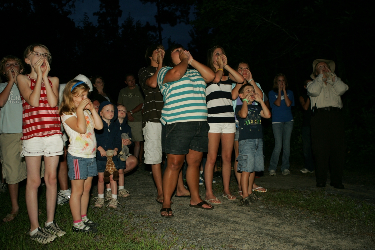 A group of children and adults take part in the wolf howling at night presentation, where they get to actually howl with the wolves on the refuge.