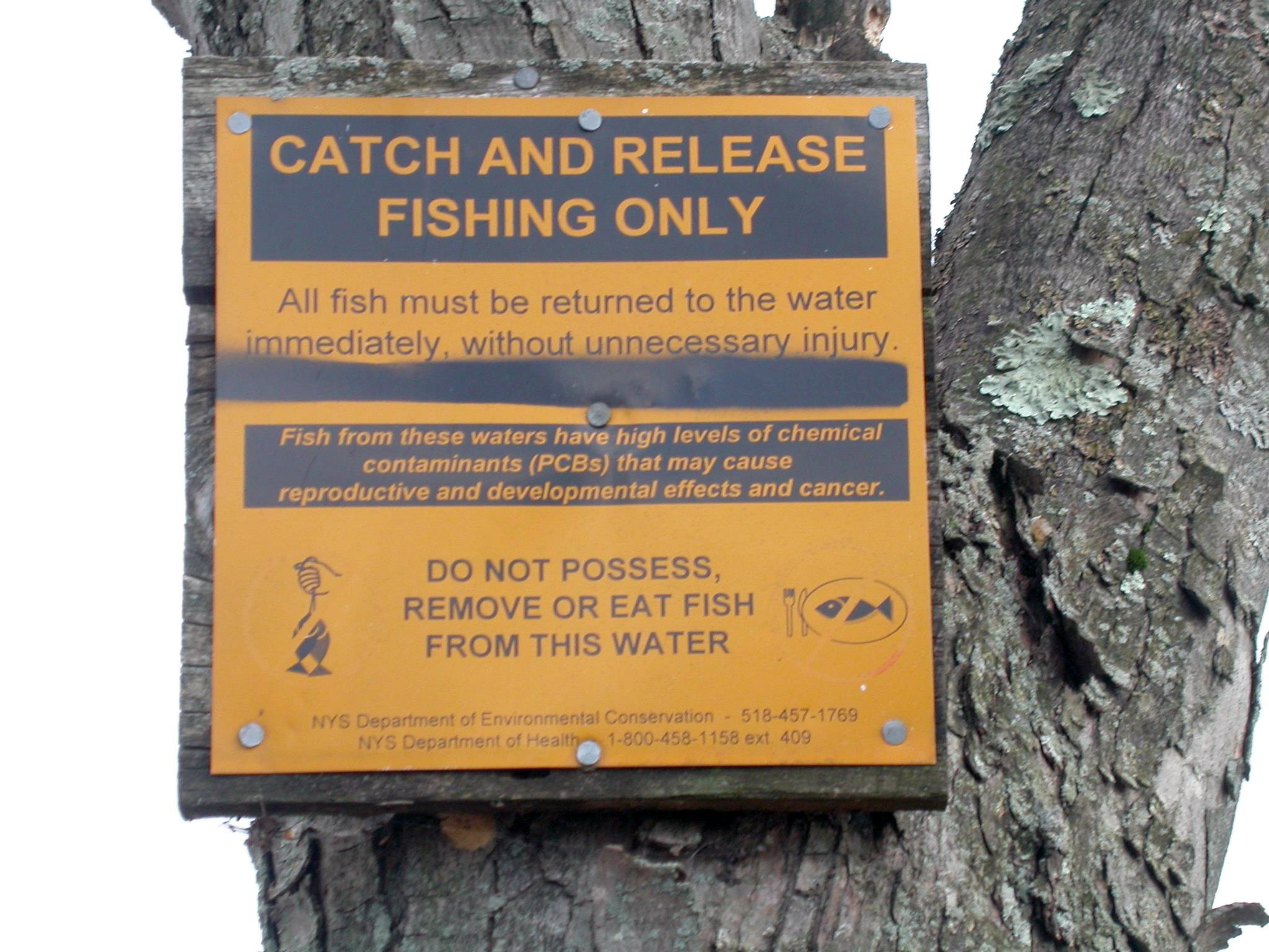 A sign posted along the Hudson River warning against eating fish from the river