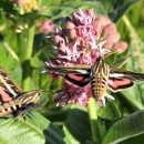 Hummingbird moth (Hyles lineata) white lined sphinx moth on showy milkweed Seedskadee National Wildlife Refuge. These amazing moths resemble hummingbirds in their flight and tendency to hover near flowers to siphon nectar.