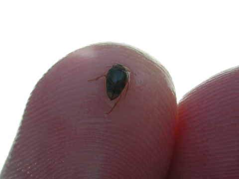 Image of a live Hungerford's Crawling Water Beetle on a finger. The size perspective is helpful and the pronotum shape character is easy to see. Brychius hungerfordi was listed as endangered on March 7, 1994, under the provisions of the U.S. Endangered Species Act. The species is found in five streams in the United States and one stream in Canada. Of these occupied streams, only the East Branch of the Maple River has consistently large numbers of beetles. At the other sites, only relatively small numbers of individuals have been found.