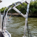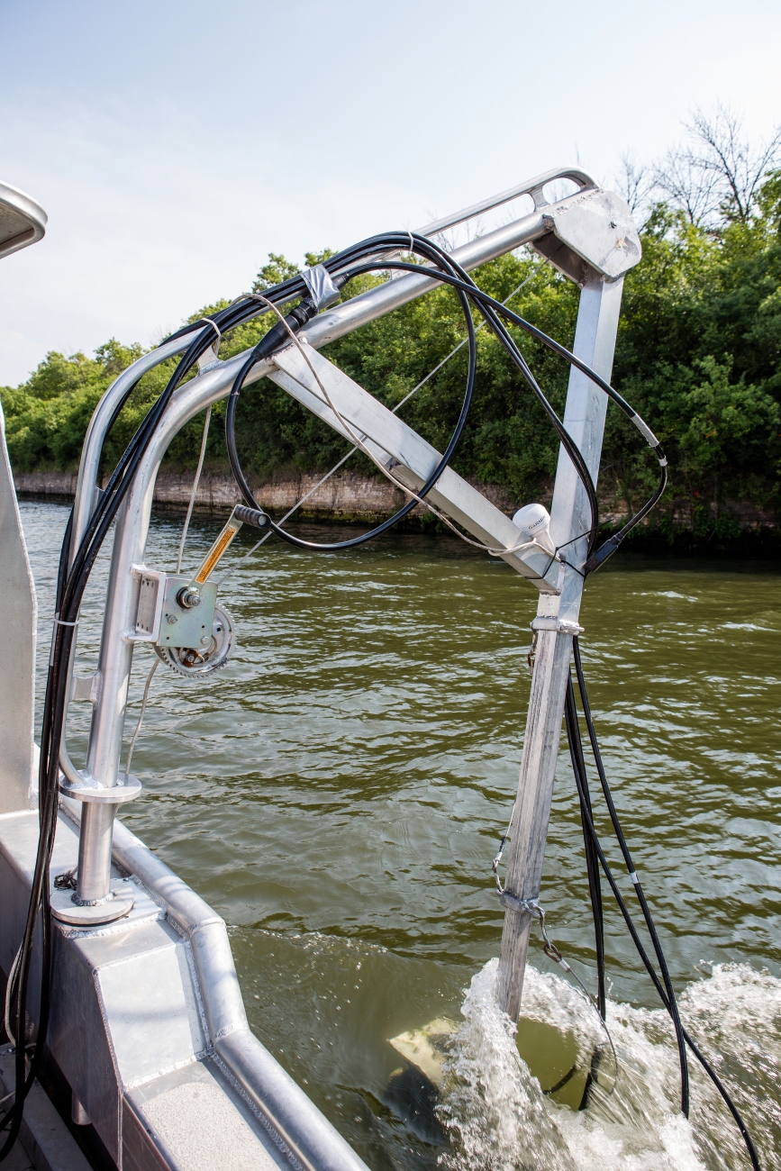 Hydroacoustics vessel the "Carpe-See-Um" with sensors in the water in the Chicago Sanitary and Ship Canal.