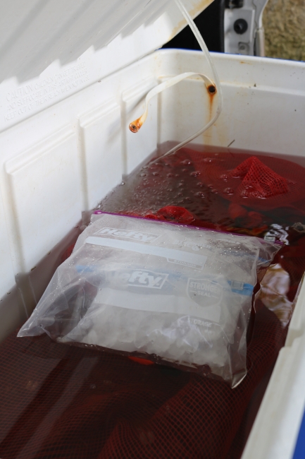 Ice can be added to a transport container to limit temperature fluctuations during transport. The ice should be double bagged to prevent residual chlorine from leaching into the transport water. Photo: Matthew Patterson, USFWS.