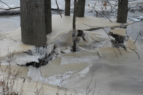 This picture shows flooding and ice in a forest.