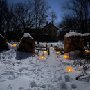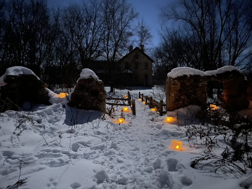 Ice luminaries on snow covered trail with Gehl Mittelstedt House in the background.