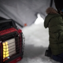 A collapsable ice shack with a portable heater offers warmth on the ice.