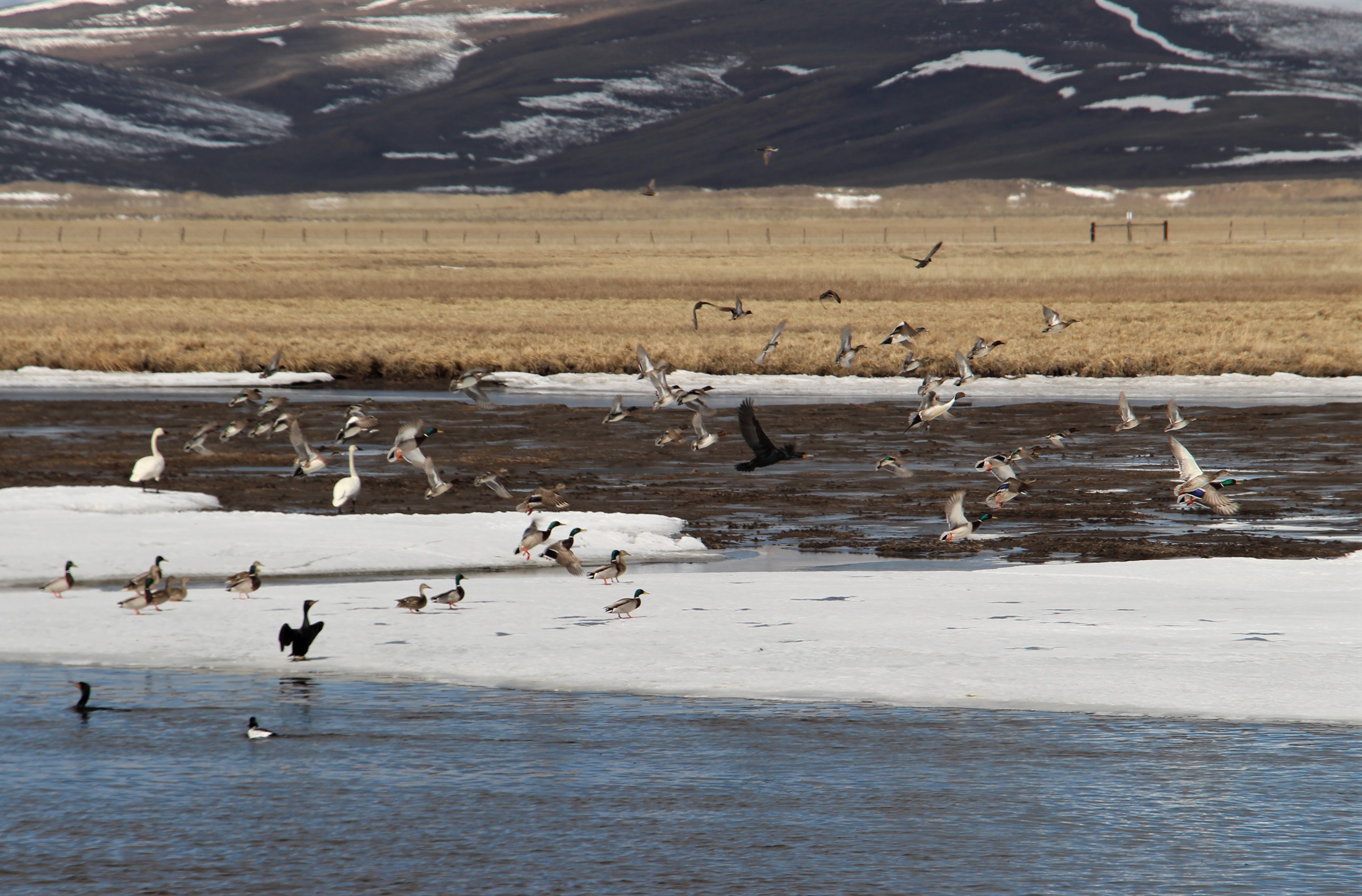 Waterfowl take flight from the Lower Lake spillway area in early icy April at Red Rock Lakes National Wildlife Refuge. Can you name all of the species present in this photo? Photo by Cortez Rohr/USFWS