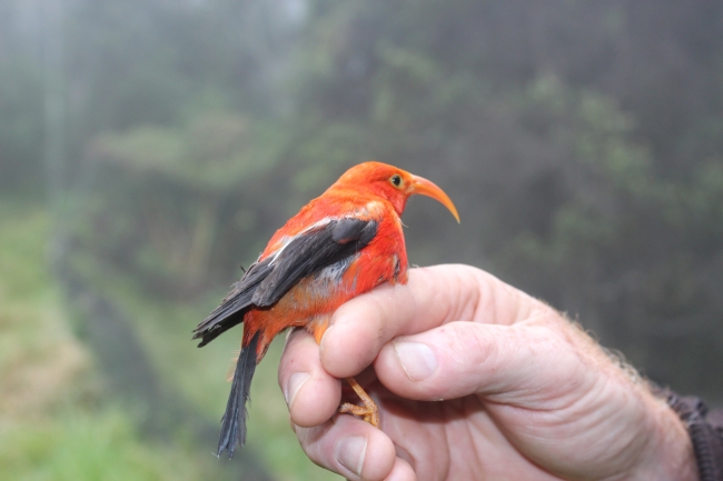 Like ‘apapane, ‘i‘iwi often fly long distances in search of flowering ‘ōhi‘a trees and are impprtant ‘ōhi‘a pollinators.