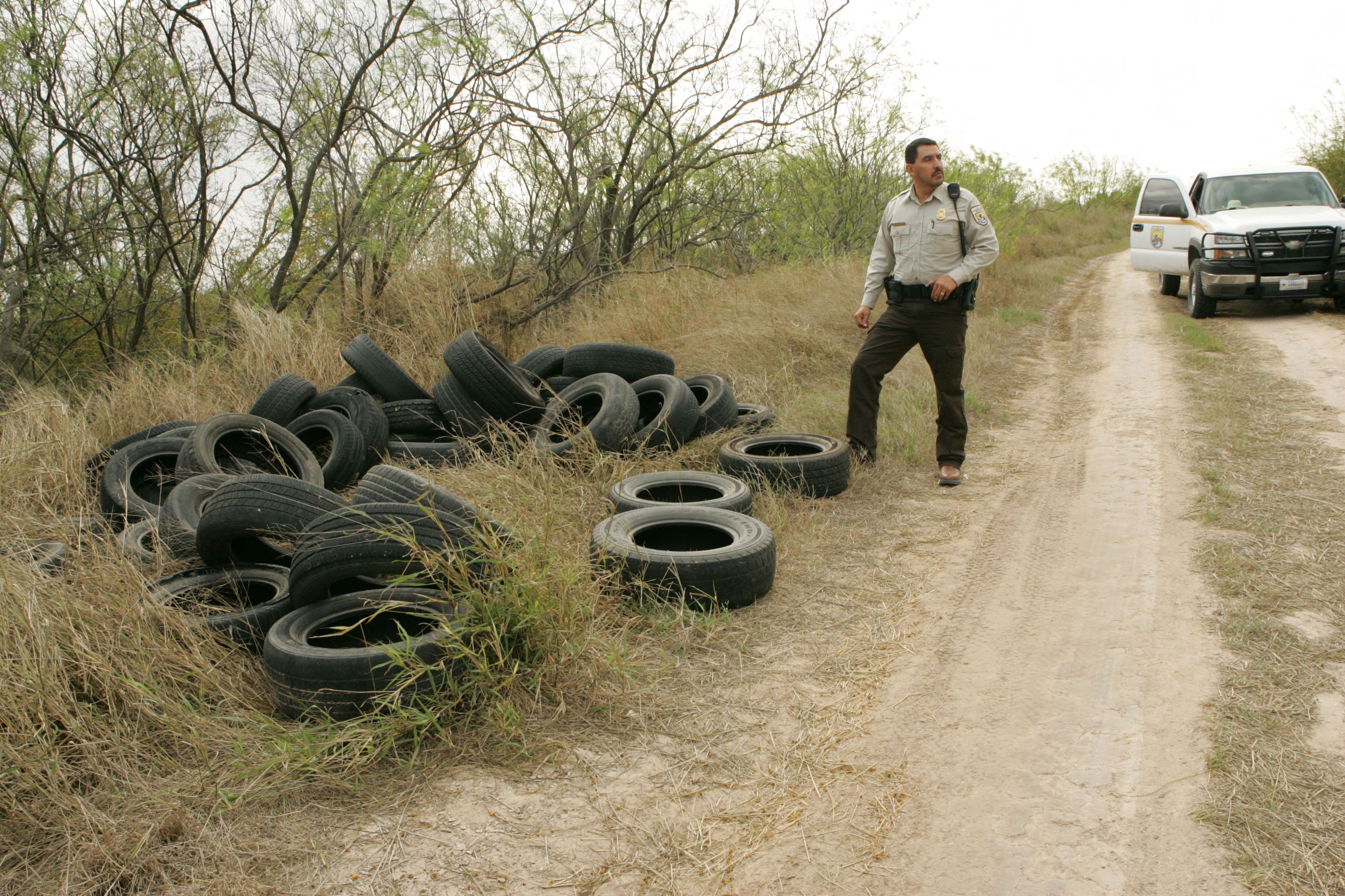A FWS law enforcement officer inspects tires that were illegally dumped on the refuge.