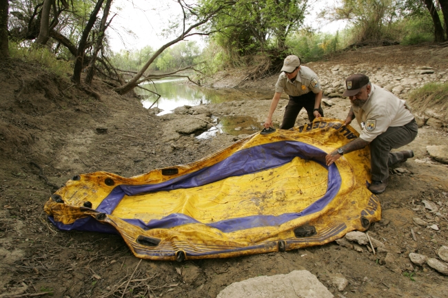 Refuge officers inspect a raft left behind by illegal aliens entering the country through the refuge.