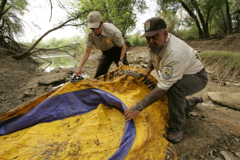 Refuge officers inspect a raft left behind by illegal aliens entering the country through the refuge.