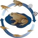 An illustration shows the stages of growth of a toad from egg to tadpole to toadlet to adult.