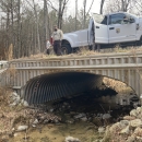Service biologists examine the arched bottomless culvert at Smith Creek in Calhoun County, Mississippi. (USFWS Photo by Angeline Rogers)