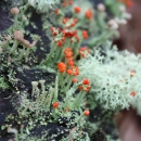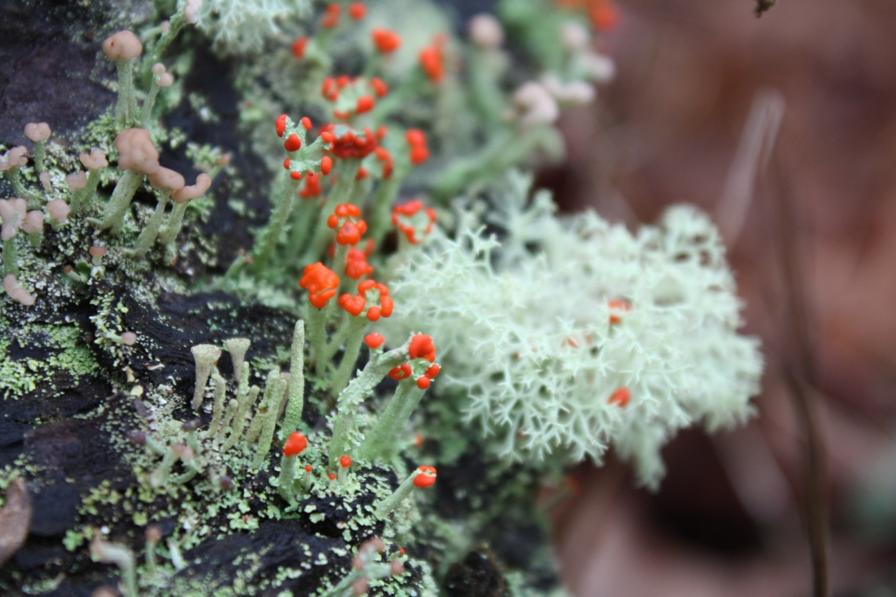 Several species of lichen on a log at Wolf Creek National Fish Hatchery's Hatchery Creek.