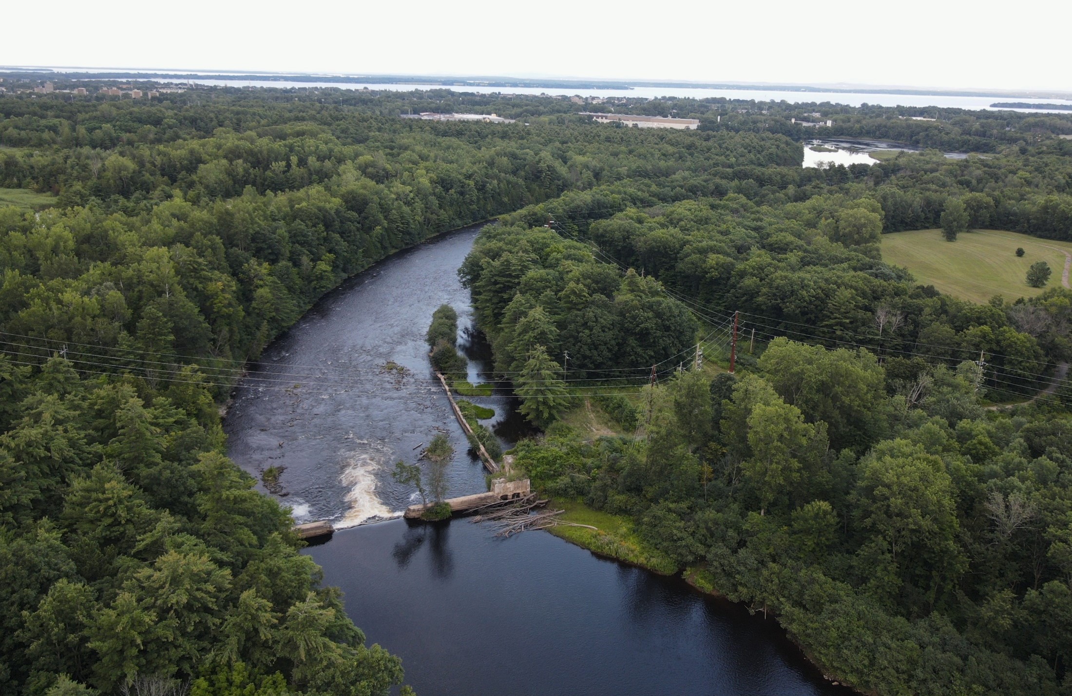 The Indian Rapids Dam before its removal. Notice how the rapids end once they reach the dam and that water past the dam is very calm. (Credit: Jacob Fetterman/Trout Unlimited)