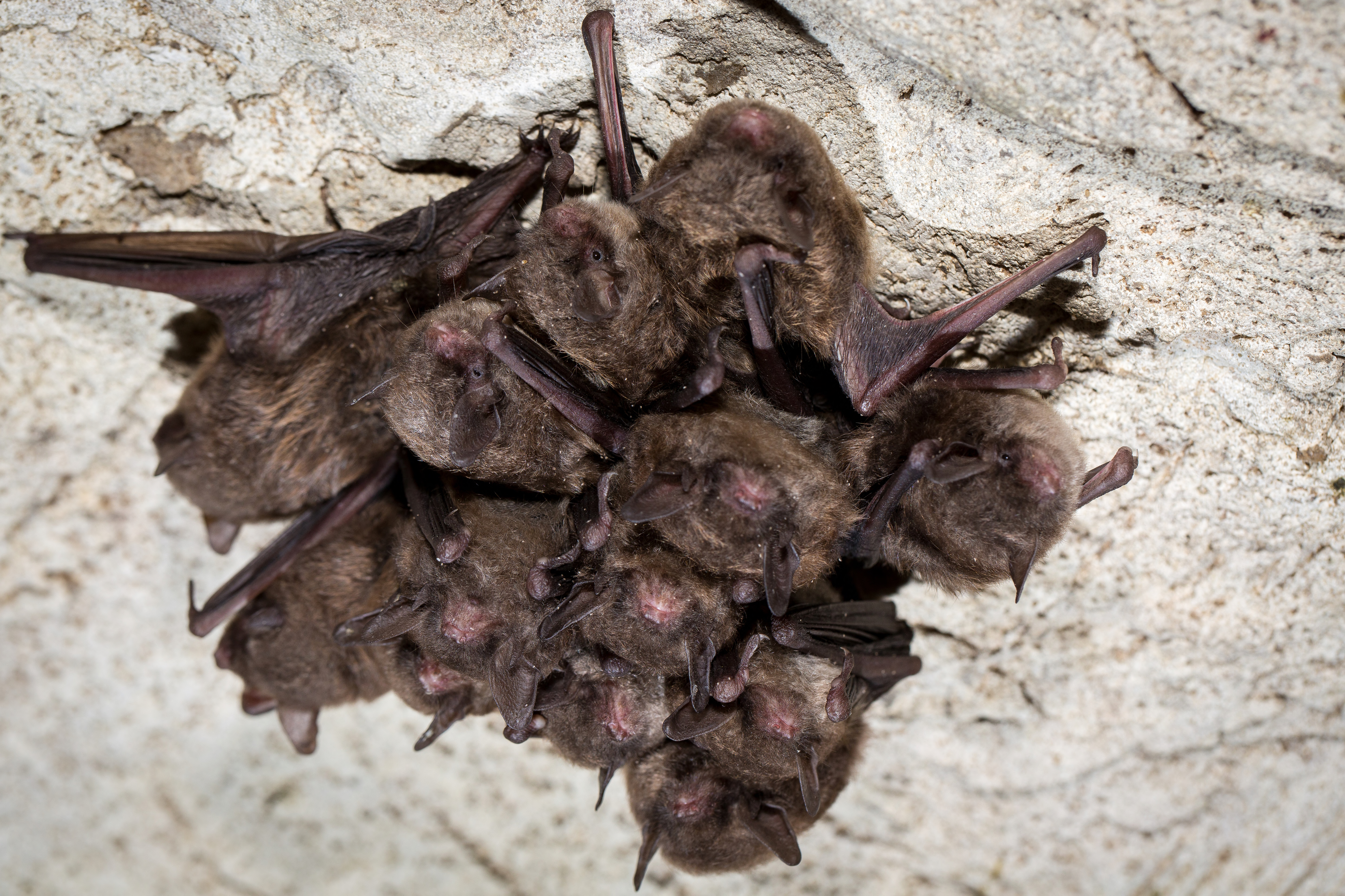 A tight cluster of Indiana bats hibernating on a cave ceiling. Carter Caves. Indiana bats hibernate in tight clusters on the ceilings and sides of caves and mines. Carters Cave