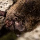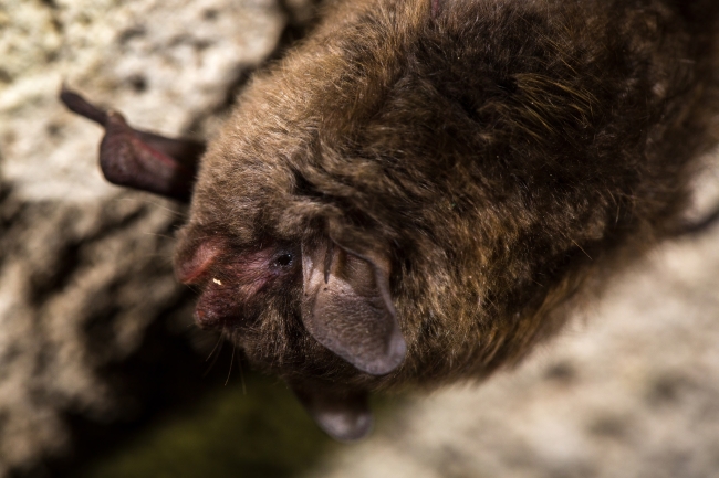 An Indiana bat hibernating on a cave ceiling. Carter Caves. Indiana bats hibernate in tight clusters on the ceilings and sides of caves and mines.
