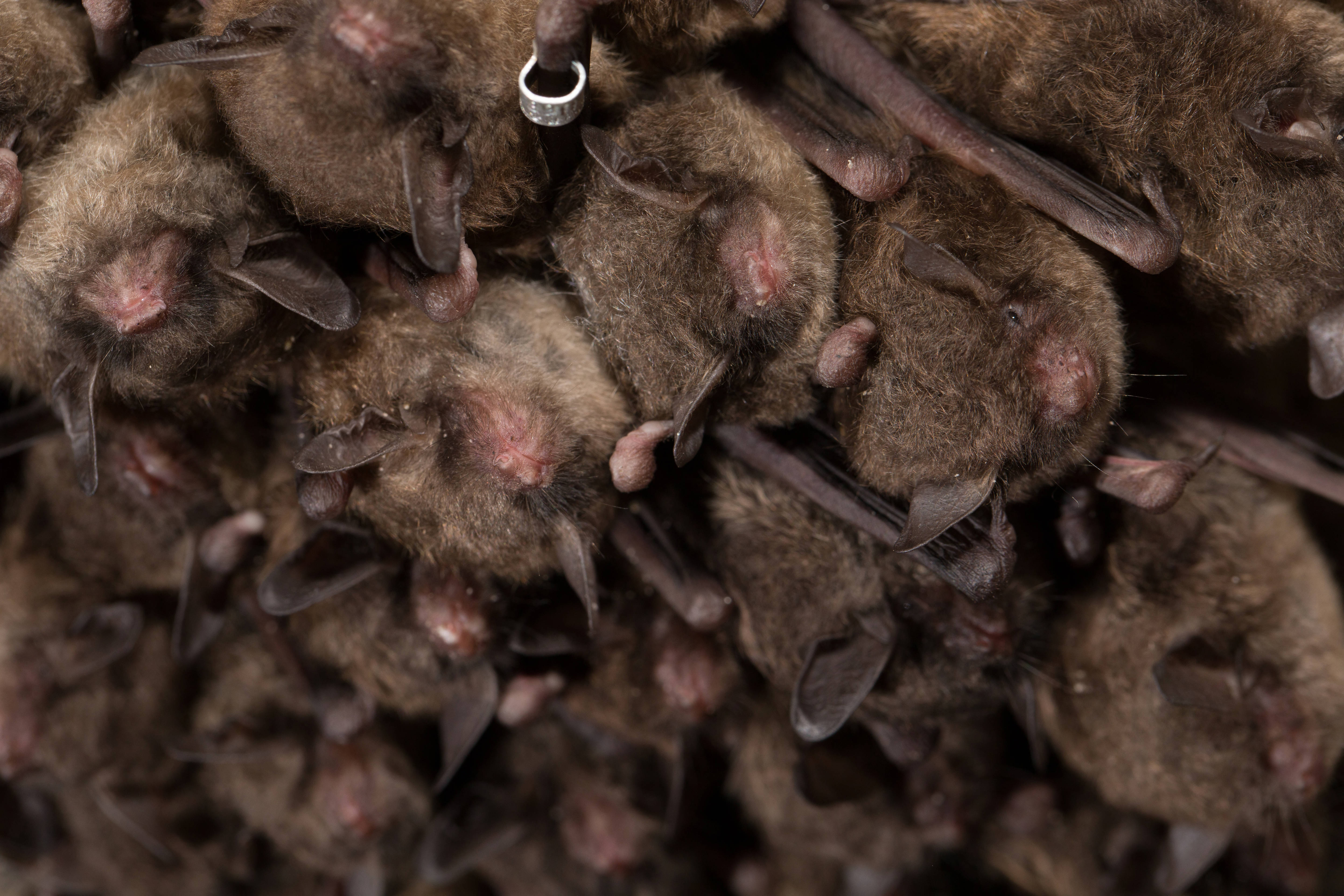 A tight cluster of Indiana bats hibernating on a cave ceiling. Indiana bats hibernate in tight clusters on the ceilings and sides of caves and mines.
