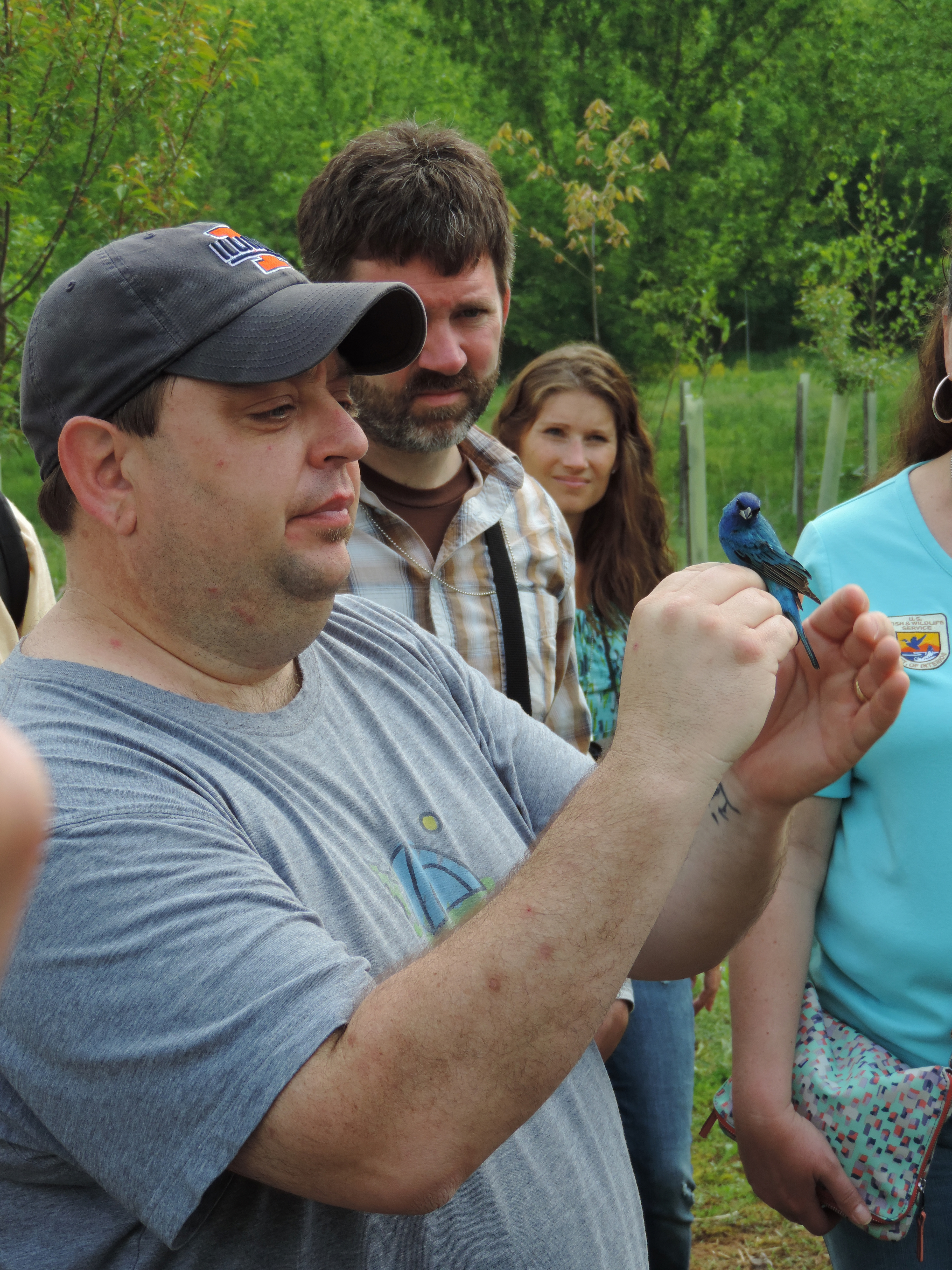 This picture shows a U.S. Fish and Wildlife Service employee holding a Indigo Bunting during the Basic Bird Biology class.