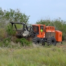Industrial tractor with drum chopper attachment performing a mechanical vegetation treatment