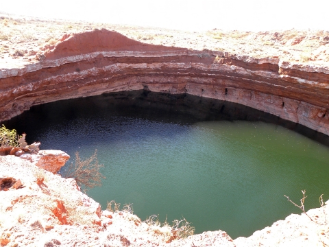 Ink spot sinkhole at Bitter Lake National Wildlife Refuge. Visitors view the geologic features, bubbling springs and unique desert wildlife make the refuge a true oasis.